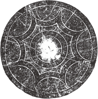 圆形。弦钮,围以凹面圈带,其外有凹面宽条带构成的内向八连弧纹,连弧的外角直抵镜缘。素卷缘。直径16.1厘米。四川成都西汉前期墓出土。《成都洪家包西汉木椁墓清理简报》图四.2(《考古通讯》1957年3期17页)。
