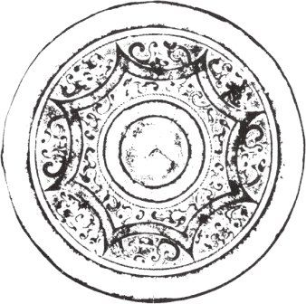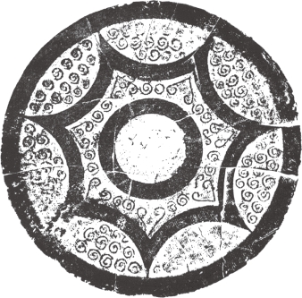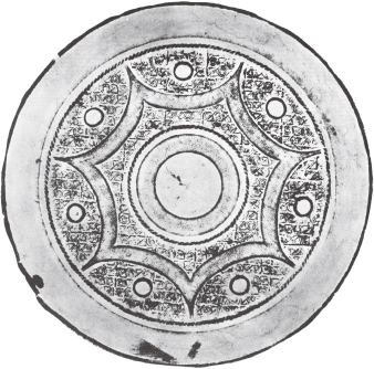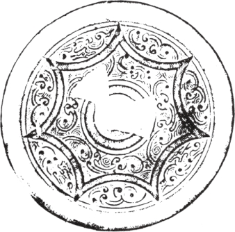 圆形。三弦钮,围以凹面圈带。纹饰由地纹与主纹构成。地纹为云雷纹。主纹为内向八连弧叠压蟠螭纹。素卷缘。直径13.5厘米。山东临沂西汉前期墓出土。《山东临沂西汉墓发现〈孙子兵法〉和〈孙膑兵法〉等竹简的简报》图三九(《文物》1974年2期26页)。