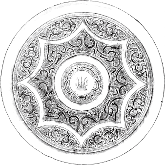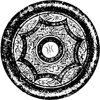圆形。钮残,围以凹面圈带。纹饰由地纹与主纹构成。地纹为不规则的涡纹及螺旋纹。主纹为内向八连弧叠压蟠螭纹,连弧内三组半形态相同的蟠螭环绕,连弧外似奔驰的蟠螭与呈C形卷曲相连的蟠螭相间环列。素卷缘。直径12.1厘米。湖北光化西汉墓出土。《光化五座坟西汉墓》图八.1(《考古学报》1976年2期159页)。