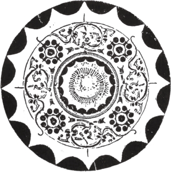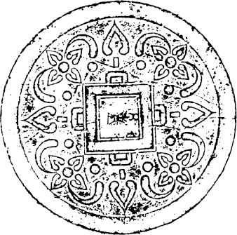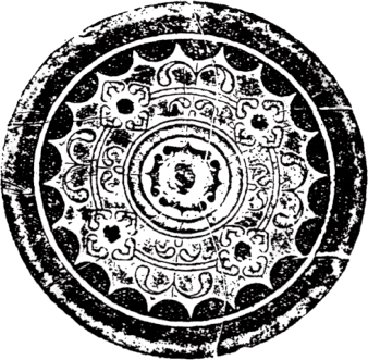 圆形。弦钮。方格外四正位配置凹形饰与桃形叶瓣纹,四隅位配置花瓣及二卷叶,八个小圆圈排列其间。素缘。直径18.5厘米,湖南长沙西汉曹摸墓出土。该墓被认为属于西汉中期武、昭、宣帝时期。《长沙咸家湖西汉曹摸墓》图四四(《文物》1979年3期15页)。