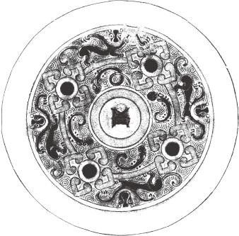 圆形。钮外凹面圈带。纹饰由地纹与主纹构成。地纹为同心圆纹。主纹为四瓣花与四龙相间环列,龙头昂起前伸,细长的身躯呈两个C形相交,两前肢伸张,仅显露一后肢,形象生动有趣。素卷缘。直径12.3厘米。《中国古代铜镜》23页图12。