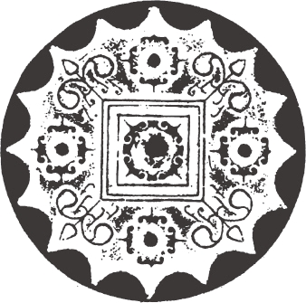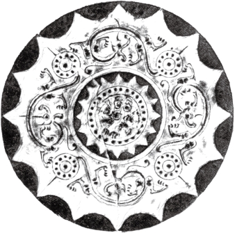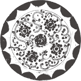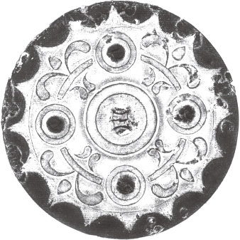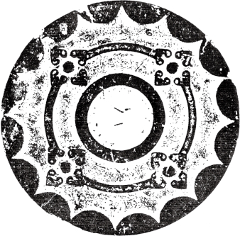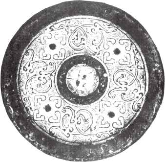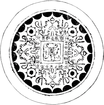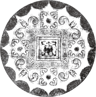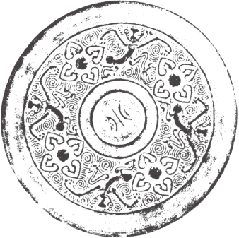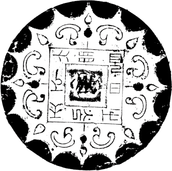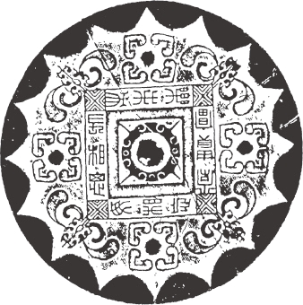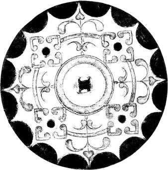 圆形。圆钮,四瓣花钮座。方格外四正位配置四瓣花,四隅位配置一苞二叶纹。十六内向连弧纹缘。直径13.4厘米。山东临沂金雀山战国晚期西汉早期墓出土。《山东临沂金雀山九座汉代墓葬》图四九.2(《文物》1989年1期43页)。