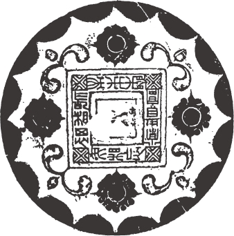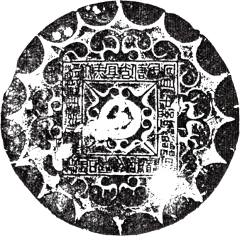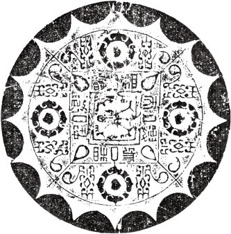 圆形。圆钮,四瓣花钮座。凹面方格四边外各排列四字铭文,字间有界格,合为:“与天无亟(极),与美相长,