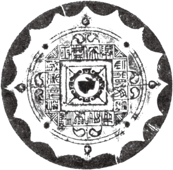 圆形。伏螭钮。方格铭文为:“与天相寿,与地相长。”方格外四正位配置花瓣纹,两侧有对称连叠花叶纹。四隅位配置二叶一苞花枝纹。十六内向连弧纹缘。直径15.9厘米。广东广州西汉前期墓出土。《广州汉墓》153页图九二.3。