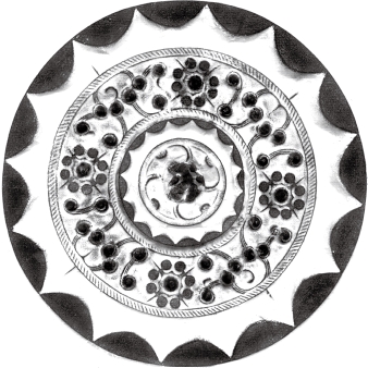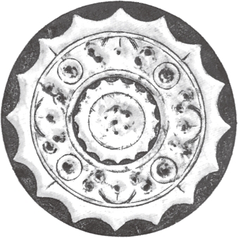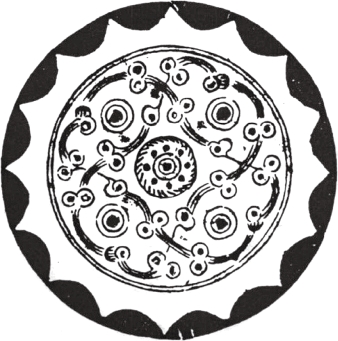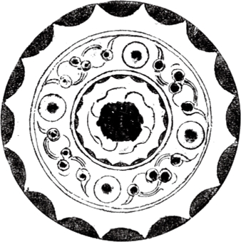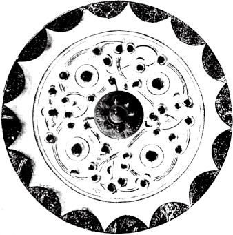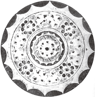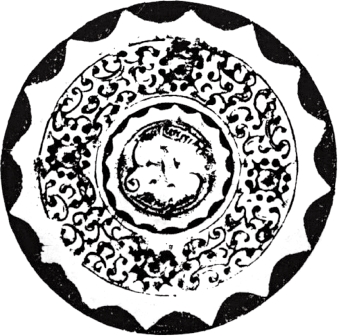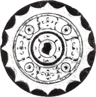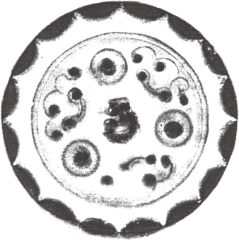 圆形。连峰钮。钮外三圆座乳与弧线相连的五枚小乳相间环列。小乳及连接它们的曲线,似星象图形,习称为星云纹。十六内向连弧纹缘。直径6.05厘米。河南南阳西汉中期墓出土。由三枚乳钉相间星云纹的图形十分少见。《南阳出土铜镜》58页图一四三。