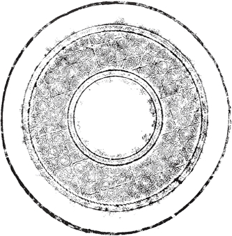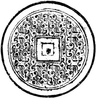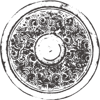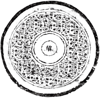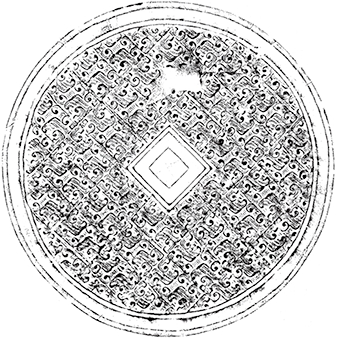 圆形。三弦钮,围以凹面圈带。其外满布羽状地纹。素卷缘。直径8.4厘米。河北邯郸出土。《历代铜镜纹饰》4页。
