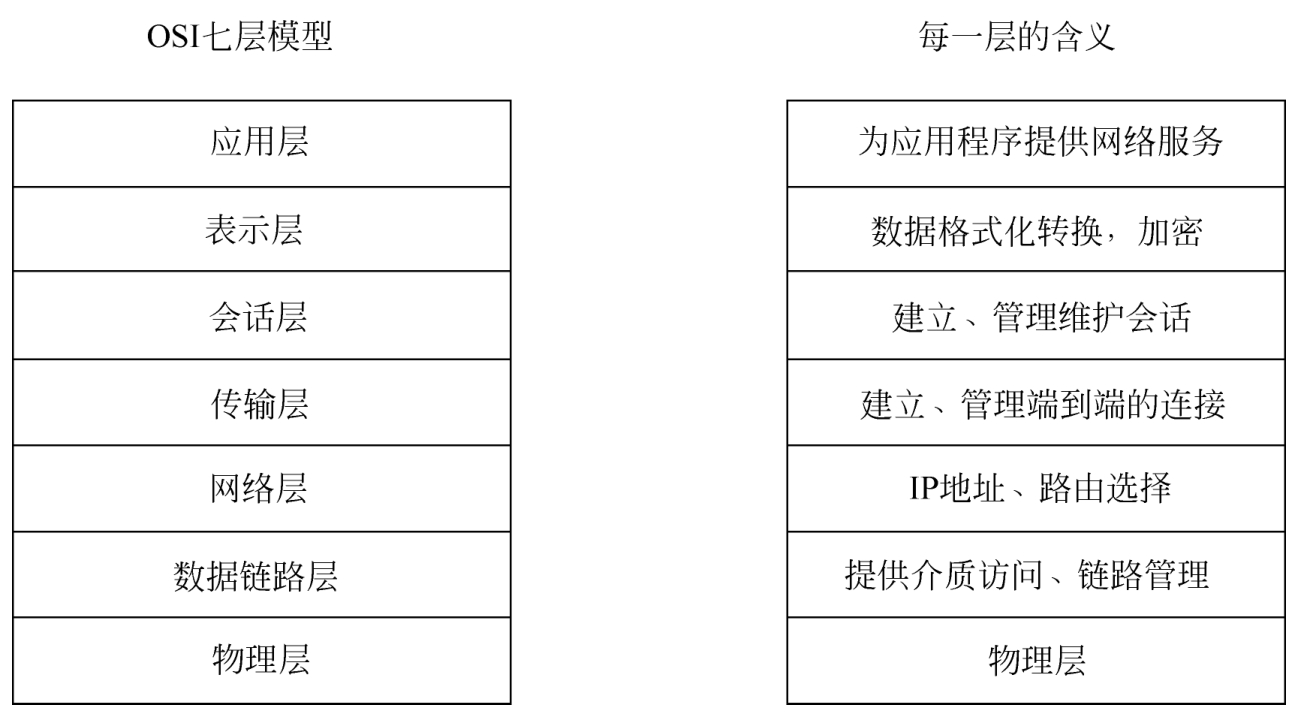 针对TCP/IP的标准化,国际标准化组织(ISO)制定的一个用于计算机或通信系统间互联的标准体系,一般称为OSI(Open System Interconnection)参考模型或七层模型。它从低到高分别是:物理层、数据链路层、网络层、传输层、会话层、表示层和应用层,如图3.1所示。