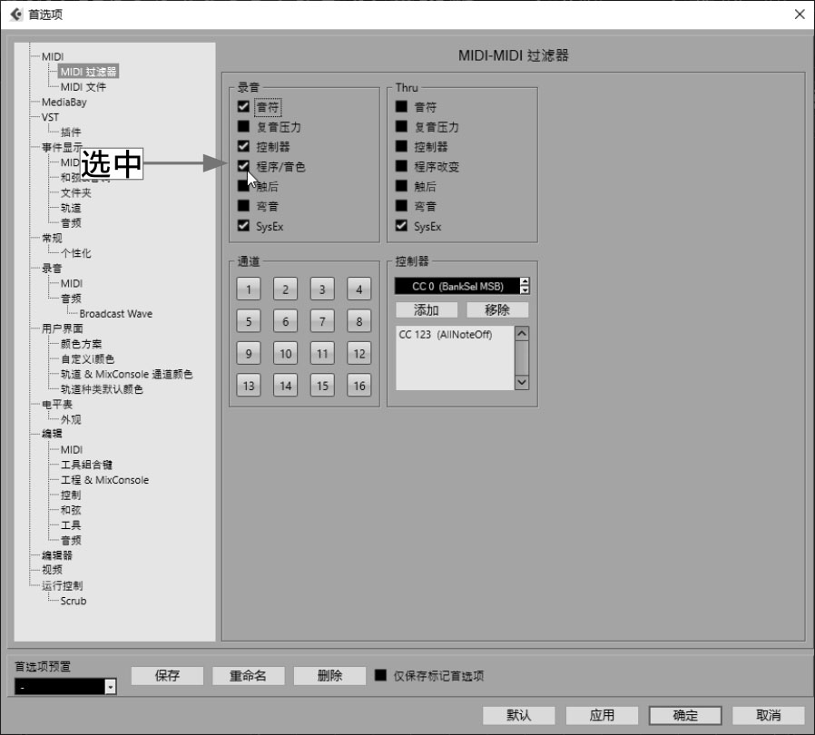 02 弹出“首选项”对话框,在对话框左侧的列表框中选择“MIDI过滤器”选项;在Thru和“录音”选项区中,依次选中“音符”和“程序改变”复选框,如图2-81所示。