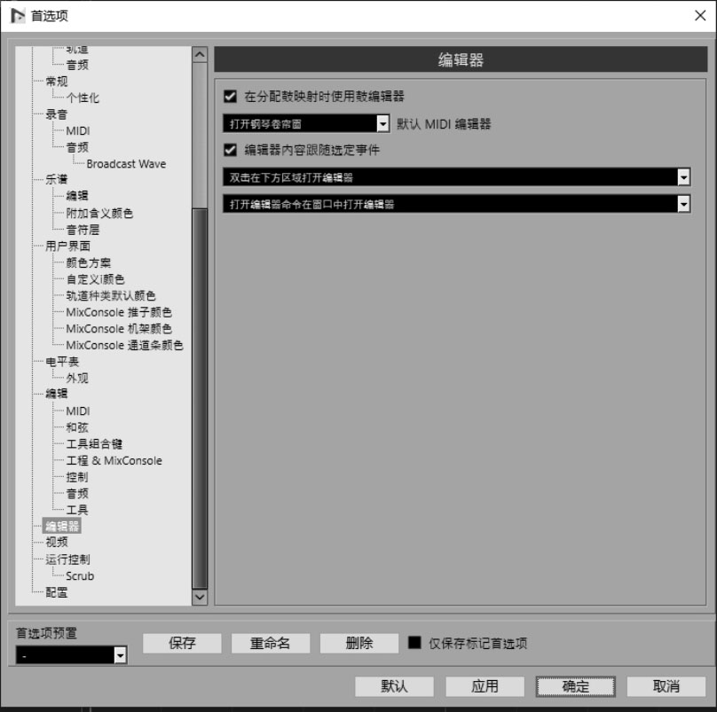 录制属性是指在录制声音时所设置的MIDI属性。在Cubase/Nuendo软件中,需要通过“首选项”对话框才能设置MIDI的录制属性,下面介绍其设置方法。