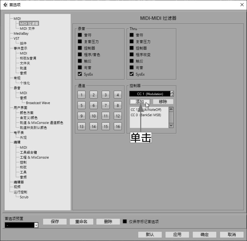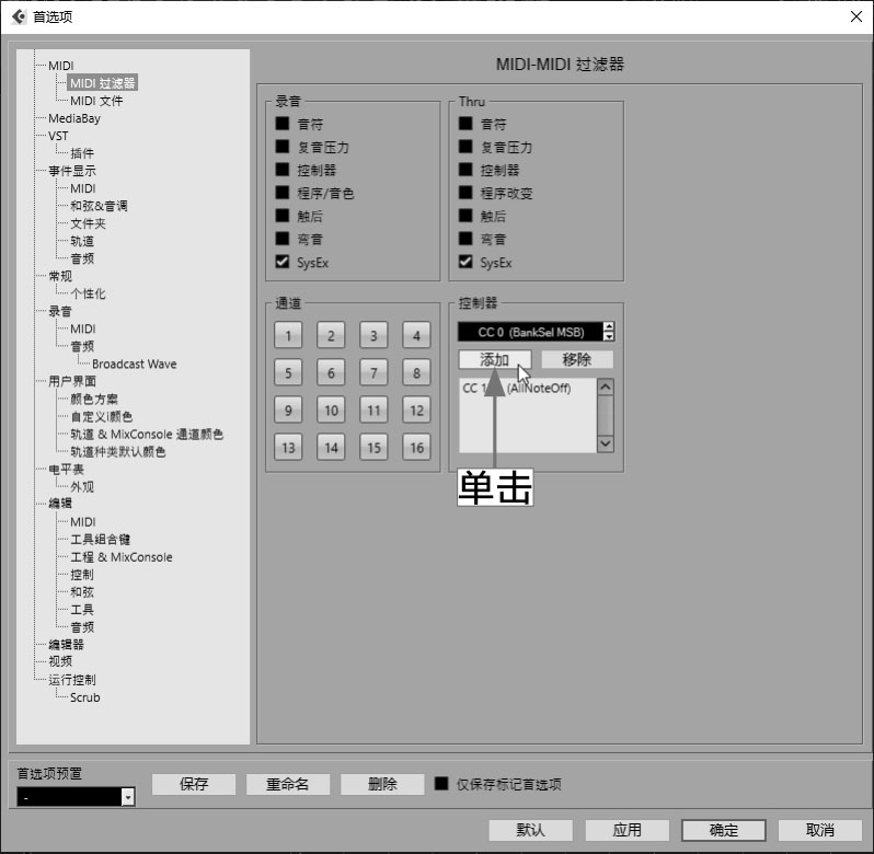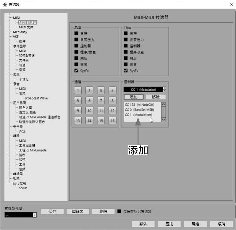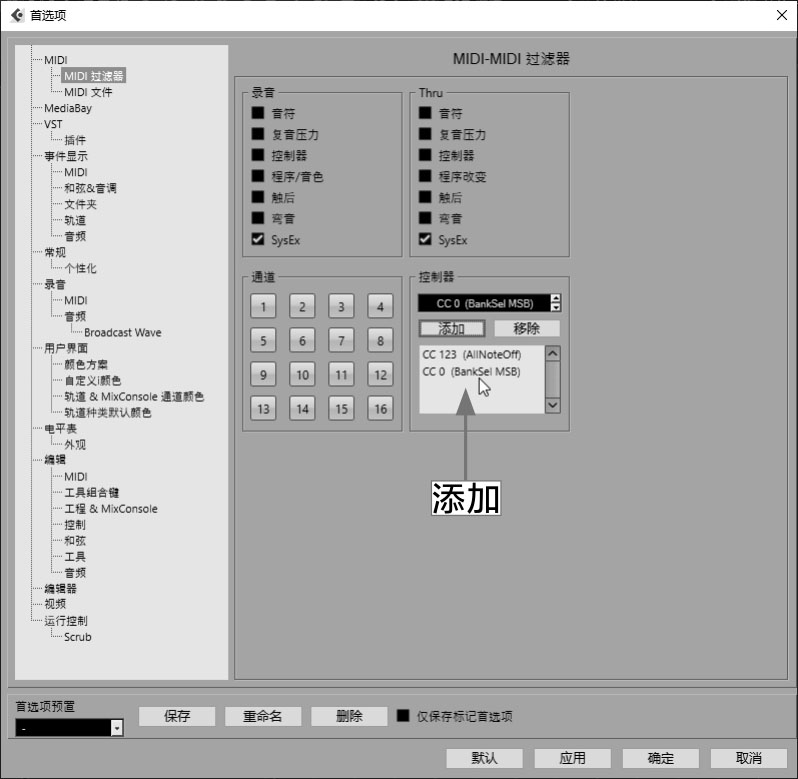 01 在Cubase界面中,选择“编辑”|“首选项”命令,弹出“首选项”对话框。在对话框左侧的列表框中选择“MIDI过滤器”选项;在“控制器”选项区中,单击“添加”按钮,如图2-84所示。