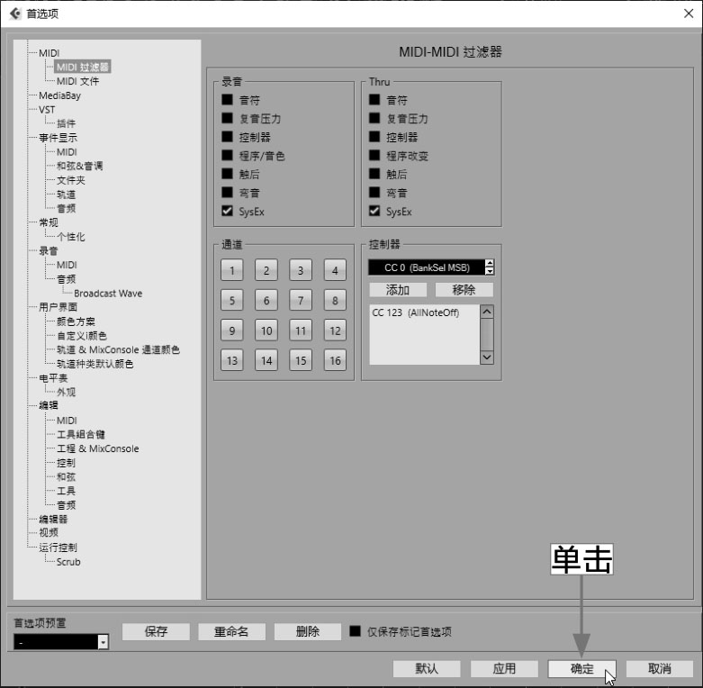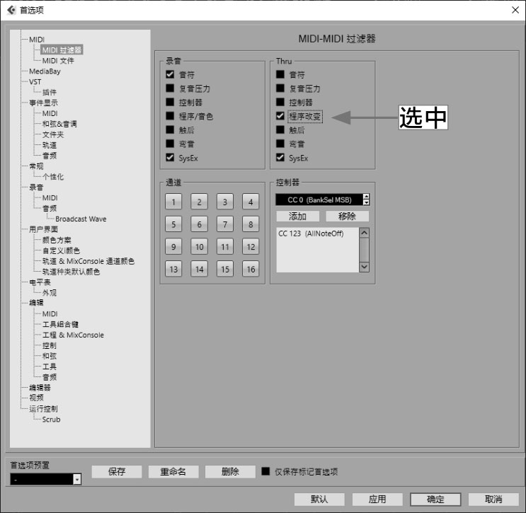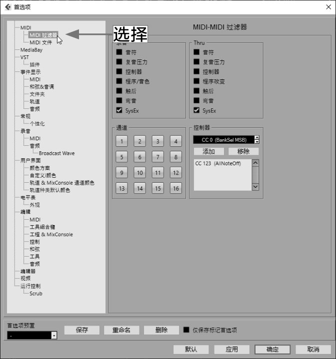 直通选项是指可以通过的过滤项目,设置该选项后,可以在输入时确保能够听到该信息所带来的变化。设置MIDI直通选项的具体操作步骤如下。