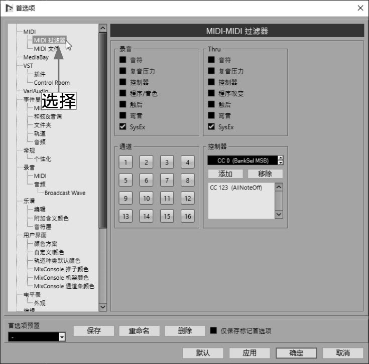 控制器是指可以过滤的控制轮信息。在“首选项”对话框的“控制器”选项区中可以从128种控制信息中任意选择一种,并将选择的信息加入被过滤的控制器选项中。