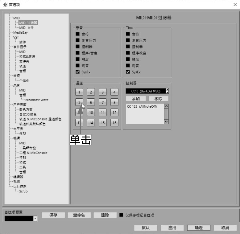 01 在Cubase界面中,选择“编辑”|“首选项”命令,弹出“首选项”对话框。在对话框左侧的列表框中选择“MIDI过滤器”选项;在“通道”选项区中,单击5按钮,如图2-82所示。