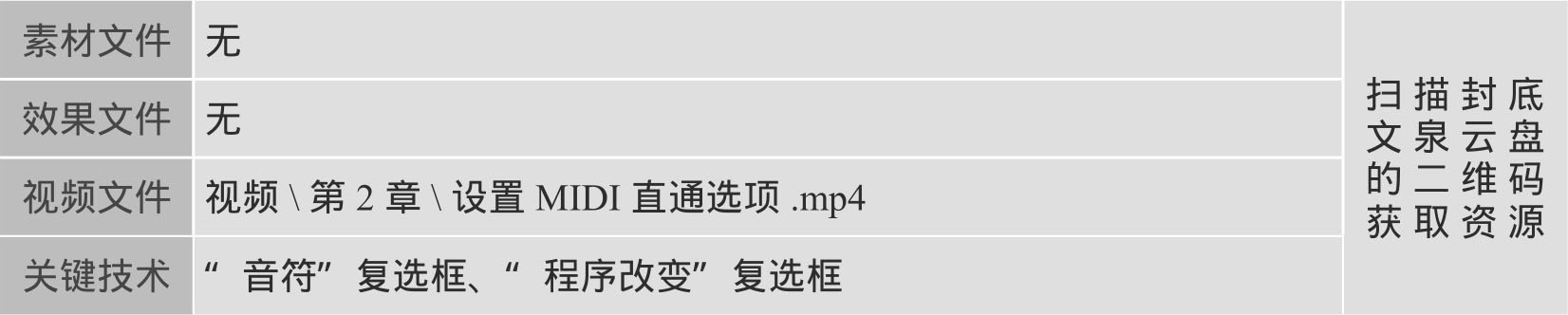 设置MIDI选项是指对MIDI的录制属性、直通选项、通道数字、控制器、导出选项以及导入选项进行设置。本节详细介绍设置MIDI选项的操作方法。