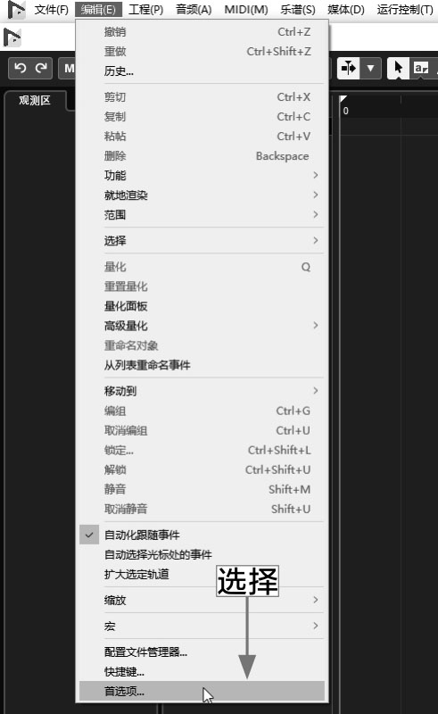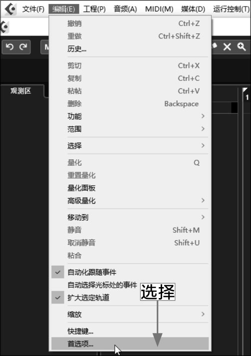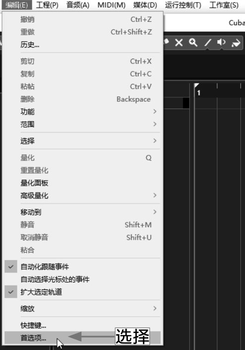 01 在Cubase界面中,选择“编辑”|“首选项”命令,如图2-80所示。
