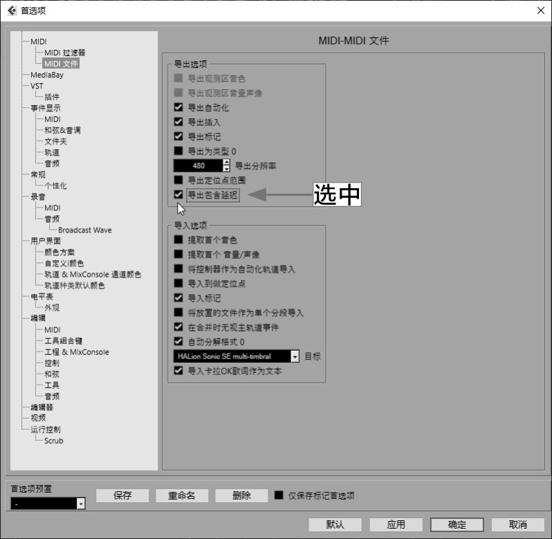 在Cubase或Nuendo软件中导出MIDI文件时,最好先设置好导出MIDI文件的各种属性。设置MIDI导出选项的具体方法是:在Cubase程序界面中,选择“编辑”|“首选项”命令,弹出“首选项”对话框,在对话框左侧的列表框中选择“MIDI文件”选项,在对话框右侧的“导出选项”选项区中依次选中“导出自动化”“导出插入”“导出标记”和“导出包含延迟”复选框,如图2-88所示,单击“确定”按钮,即可设置MIDI导出选项。