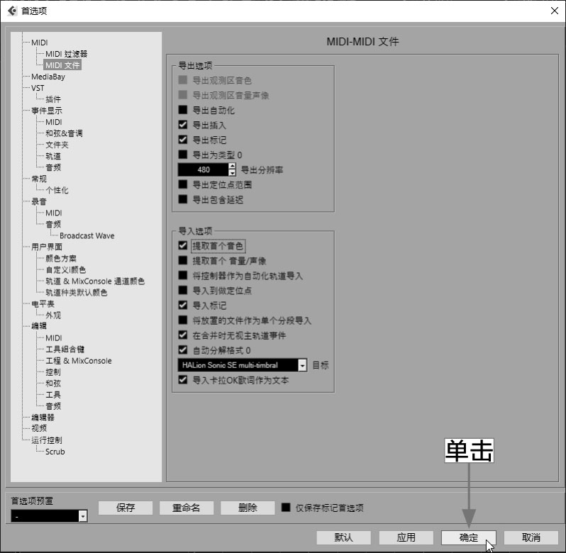 导入选项是指在导入MIDI文件时设置的导入选项参数。在Cubase界面中,选择“编辑”|“首选项”命令,弹出“首选项”对话框,在对话框左侧的列表框中选择“MIDI文件”选项,在对话框右侧的“导入选项”选项区中选中“提取首个音色”“导入标记”和“在合并时无视主控轨事件”复选框,单击“确定”按钮,如图2-89所示,即可完成设置MIDI的导入选项。