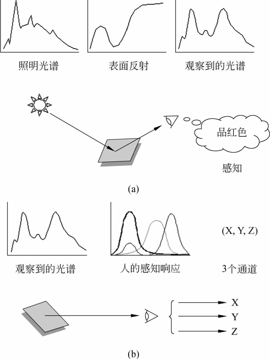 (a)光线经反射进入人眼后,人感知物体表面的颜色;(b)3个通道的颜色信号