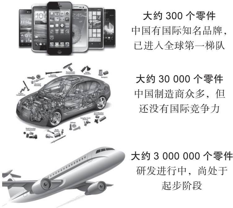 越是简单的产品,批量一般也越大,中国制造的优势也越明显。对复杂度在手机级别的产品(BOM数量以千百计),比如电视机、洗衣机、电冰箱、计算机,中国已经在全球领先,表现为我们有国际知名品牌。对于复杂度在汽车级别的产品(BOM数量以万千计),我们已经有相当的竞争力,但还没有实现全球领先,但也只是时间问题。对于复杂度在飞机级别的产品(BOM数量以几十万、百万计),我们尚处于起步阶段,大部分领域完成了从无到有,有些领域正在实现零的突破。