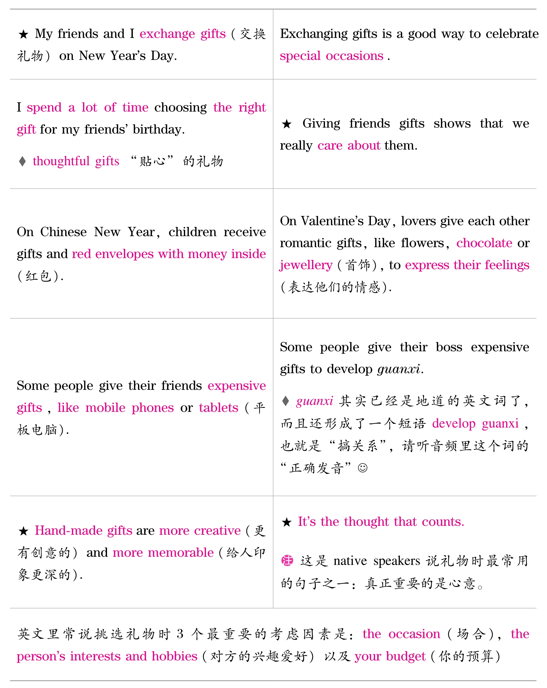 ★ They give me thoughtful gifts (“贴心”的礼物),like my favourite snacks , books or gift cards (礼品卡)for my favourite shops.