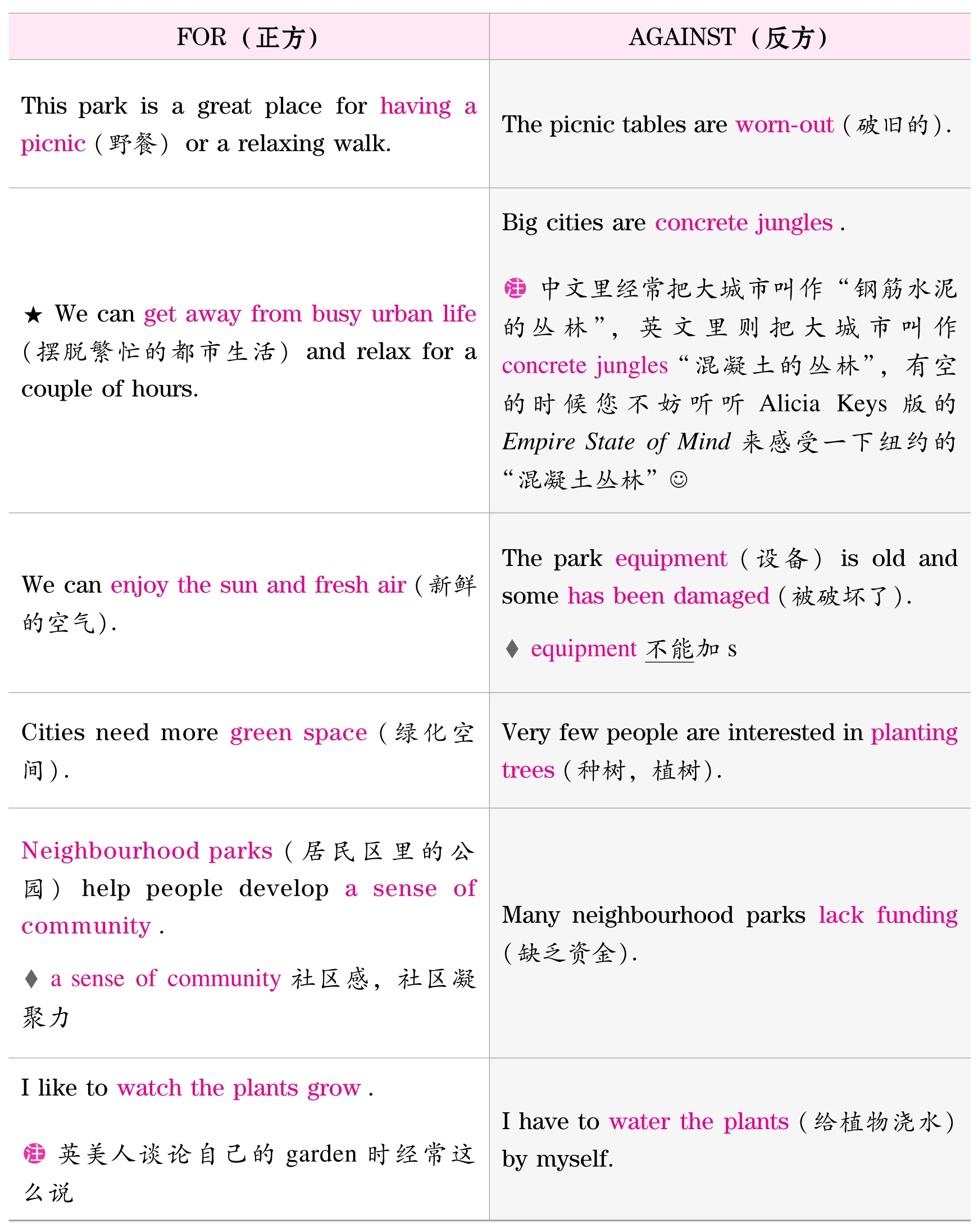 ☆ native speakers谈到自己喜欢的公园或花园时特别爱说的一句话是This park/garden is an oasis from city life . oasis的意思是“绿洲”,请注意听音频里的正确读音
