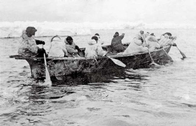 在阿拉斯加西北部捕猎鲸鱼的木架蒙皮船(约1905年5月),是将一张去毛