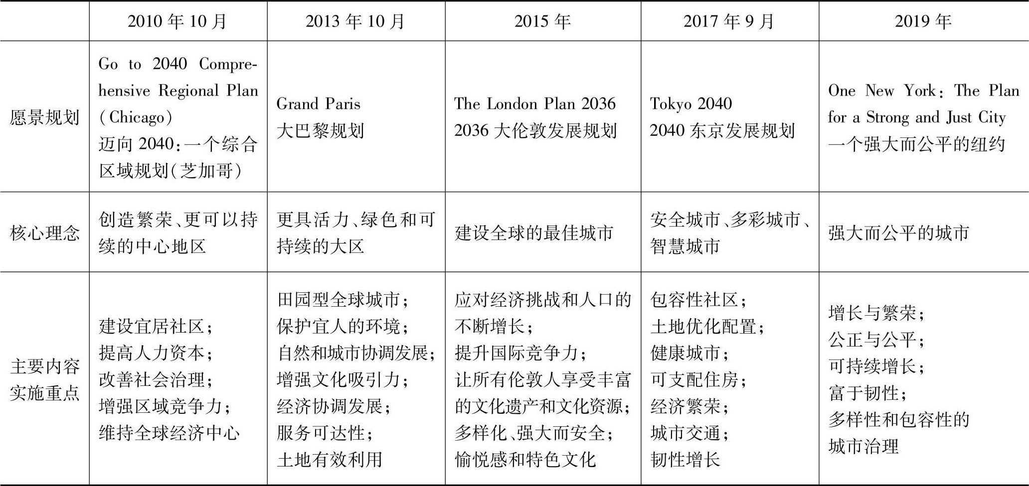 上海建设卓越全球城市的规划和实施,是在其他世界级大都市纷纷制定和实施面向 2035 年和 2040 年远景规划的背景下展开的。2010 年以来,上海对标的其他世界级大都市先后颁布了面向未来的发展规划。它们立足于本国的国情和各自的市情,各显所长,各擅胜场,也表现出诸多相通的共性,如《芝加哥 2040》规划涵盖了芝加哥市和周边的 7 个县和 284 个自治市,形成了对大城市群的层级布局和整体协调,显示了注重大城市区域一体化发展的理念;它强调可持续增长,把创新引领、经济辐射、文化魅力、智慧效能等目标综合起来;它注重人文关怀,让五大湖地区的城市和各级乡镇风貌充满愉悦感,并与湖区的生态保护相结合等。而《纽约:强大而公平的城市规划》则强调了面向未来的四大愿景:增长与繁荣、公正与公平、可持续增长、富于韧性,在未来要把增长与繁荣、公正与公平、可持续增长、富于韧性、多样性和包容性的城市治理等要求有机地结合起来,把纽约建设成为保持文化多样性和广泛吸引力、在未来能够应对各种挑战的世界之都。