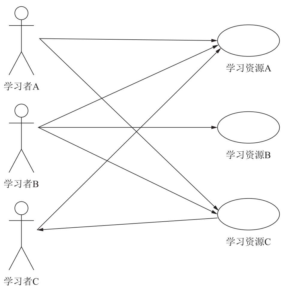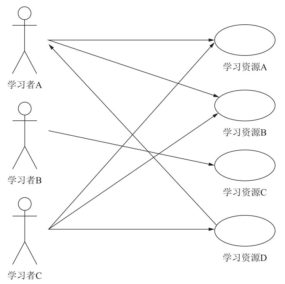 图2-4给出的是基于项目的协同过滤推荐机制的基本原理:假设学习者A喜欢学习资源A和C,学习者B喜欢学习资源A、B和C,学习者C喜欢学习资源A,从这些用户的历史喜好可以分析出,喜欢学习资源A的人都喜欢学习资源C,学习资源A和C是比较类似的,基于这个数据可以推断学习者C很有可能也喜欢学习资源C,所以系统会将学习资源C推荐给学习者C。