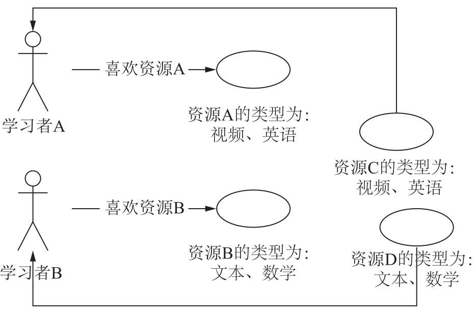 图2-3给出了基于用户的协同过滤推荐机制的基本原理:假设学习者A喜欢学习资源A和学习资源B,学习者B喜欢学习资源C,学习者C喜欢学习资源A、学习资源B和学习资源D;从这些用户的历史喜好信息中,我们可以发现学习者A和学习者C的口味和偏好是比较类似的,因为学习者C还喜欢学习资源D,那么我们可以推断学习者A可能也喜欢学习资源D,因此可以将学习资源D推荐给学习者A。