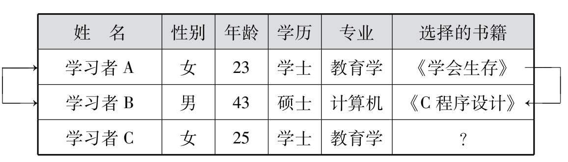 系统会给学习者C推荐什么书籍呢?根据基于人口统计学推荐的原理,首先系统计算学习者C与学习者A、B之间的相似程度。计算机发现在性别、年龄、学历以及专业等4个维度上,学习者C与学习者A更相似,学习者A是学习者C的“邻居”,系统就会将学习者A选择的书籍《学会生存》推荐给学习者C。