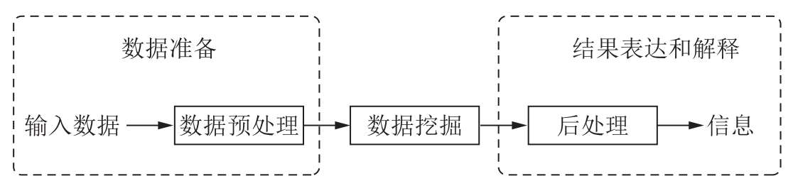 数据挖掘是数据库中知识发现( Knowledge Discovery in Data base,KDD )不可缺少的一部分。知识发现过程是将未加工的数据转换为有用信息的整个过程,由以下 3 个阶段组成:①数据准备;②数据挖掘;③结果表达和解释。如图 3-1 所示。该过程包括一系列转换步骤,从数据预处理到数据挖掘结果的后处理。输入数据可以是各种形式的数据,如平面文件、电子表格或关系表等,且可以存储在集中式数据库中,或分布在多个数据站点上。数据预处理的目的是将原始输入数据转换为适当的格式,以便进行后续分析。数据预处理涉及的步骤包括融合来自多个数据源的数据,清洗数据以消除噪声和重复的观测值,选择与当前数据挖掘任务相关的记录和特征等。由于收集和存储数据的方式多种多样,数据预处理可能是整个知识发现过程中最费力、最耗时的步骤。后处理通常指将数据挖掘结果集成到决策支持系统的过程,是数据挖掘后期结果表达与解释的重要步骤,能够确保只将那些有效的和有用的结果集成到决策支持系统中。后处理的一个例子是可视化,它使得数据分析者可以从各种不同的视角探查数据和数据挖掘结果。在后处理阶段,还能使用统计度量或假设检验,删除虚假的数据挖掘结果。