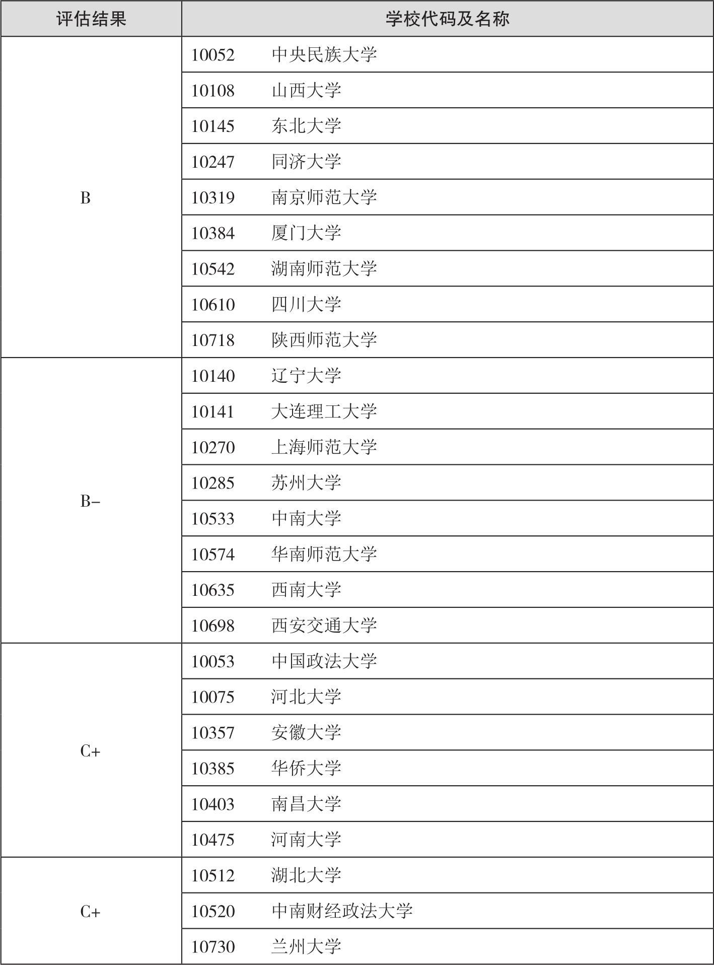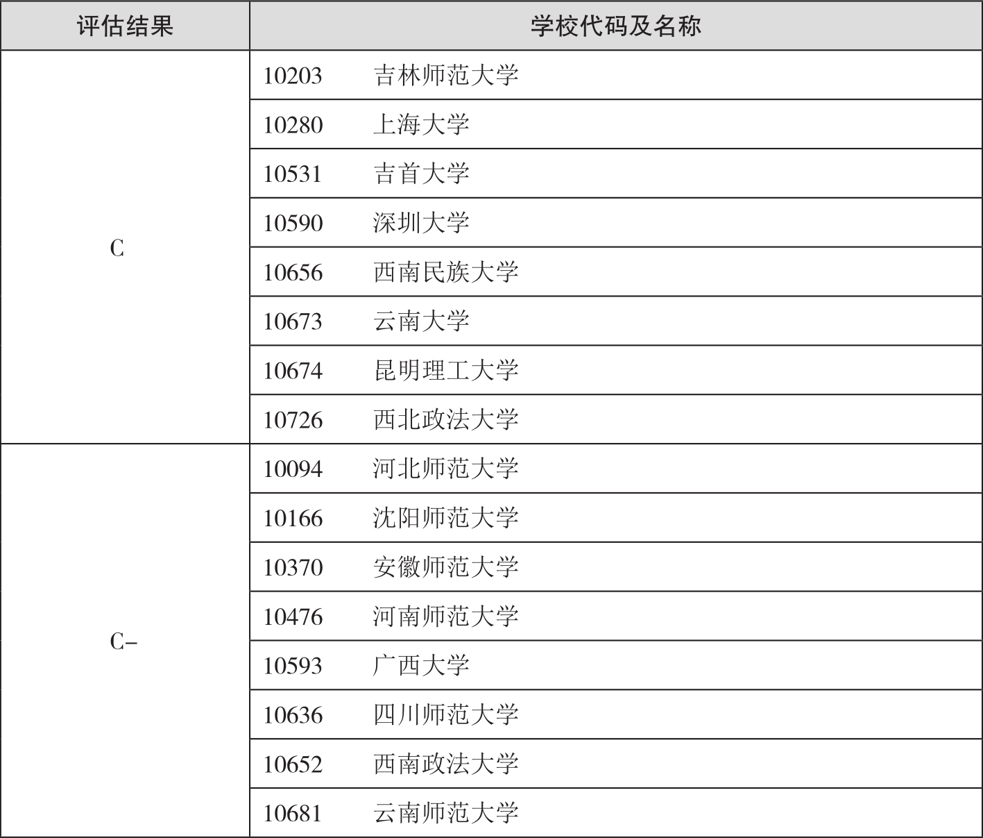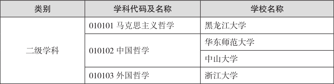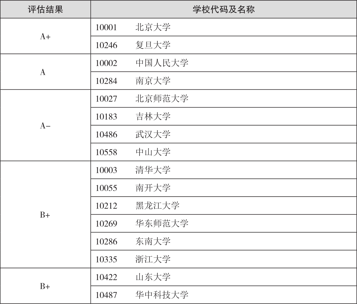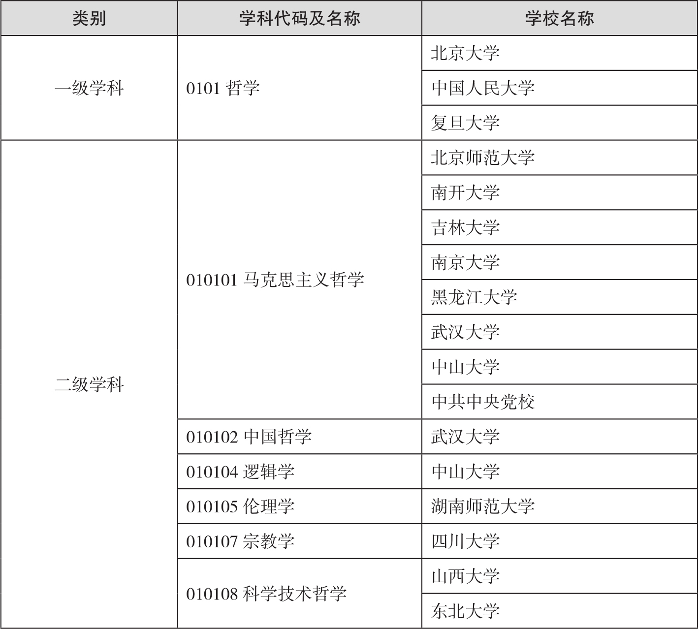 哲学类在教育部第四轮学科评估中共84所学校参评,北京大学、复旦大学评定为A+,中国人民大学、南京大学评定为A,北京师范大学等4所高校评定为A-。参评高校评定结果见下表: