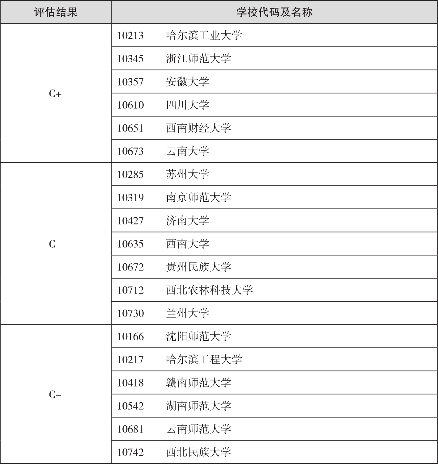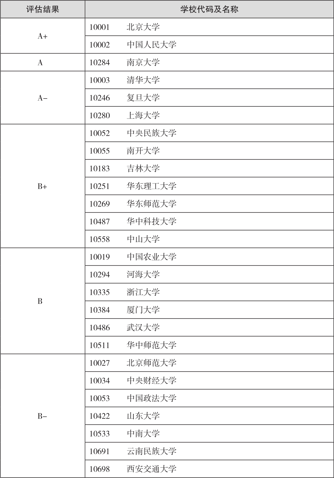 第四批专业评估中,北京大学和中国人民大学获评A+等级,南京大学获得A级,清华大学、复旦大学和上海大学获得A-的评级。具体排名见下表: