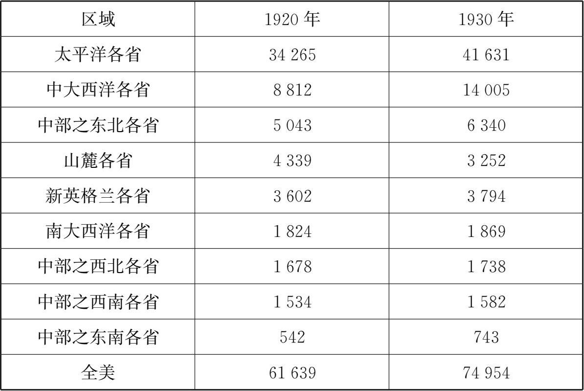 表1-2 1920年至1930年美国华侨人口区域分布表