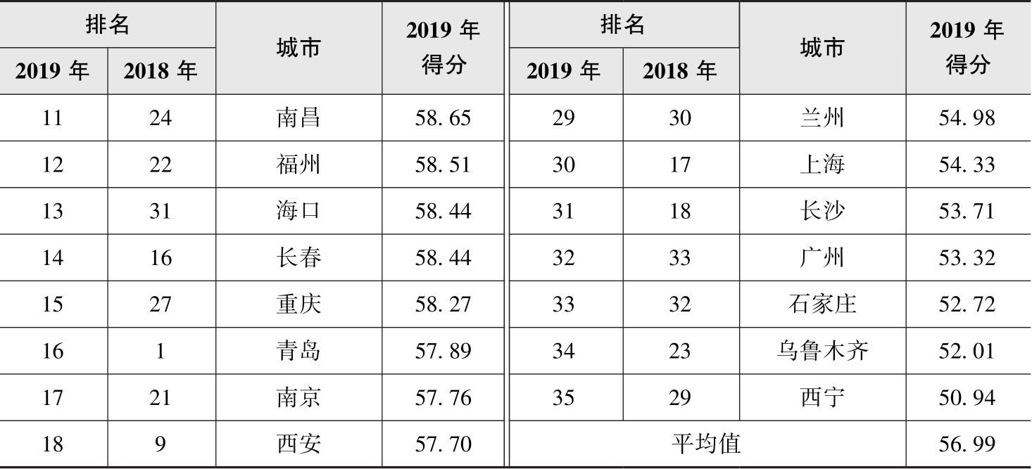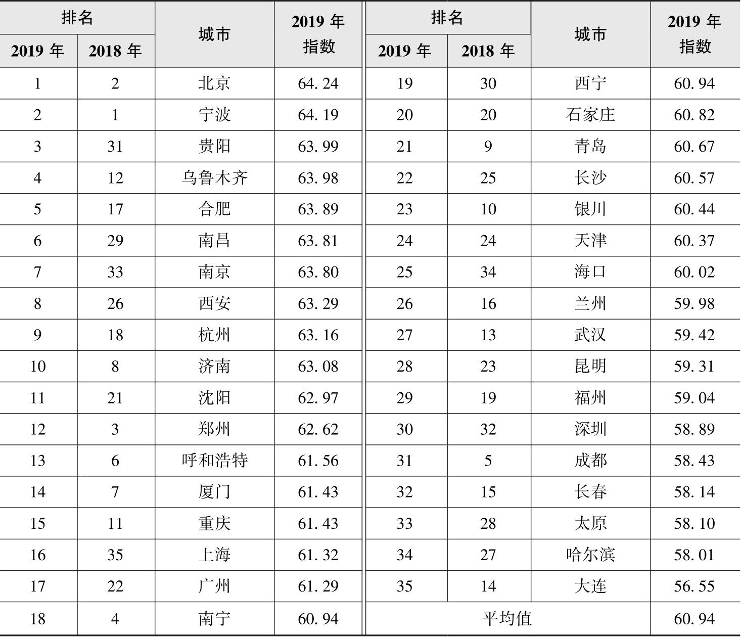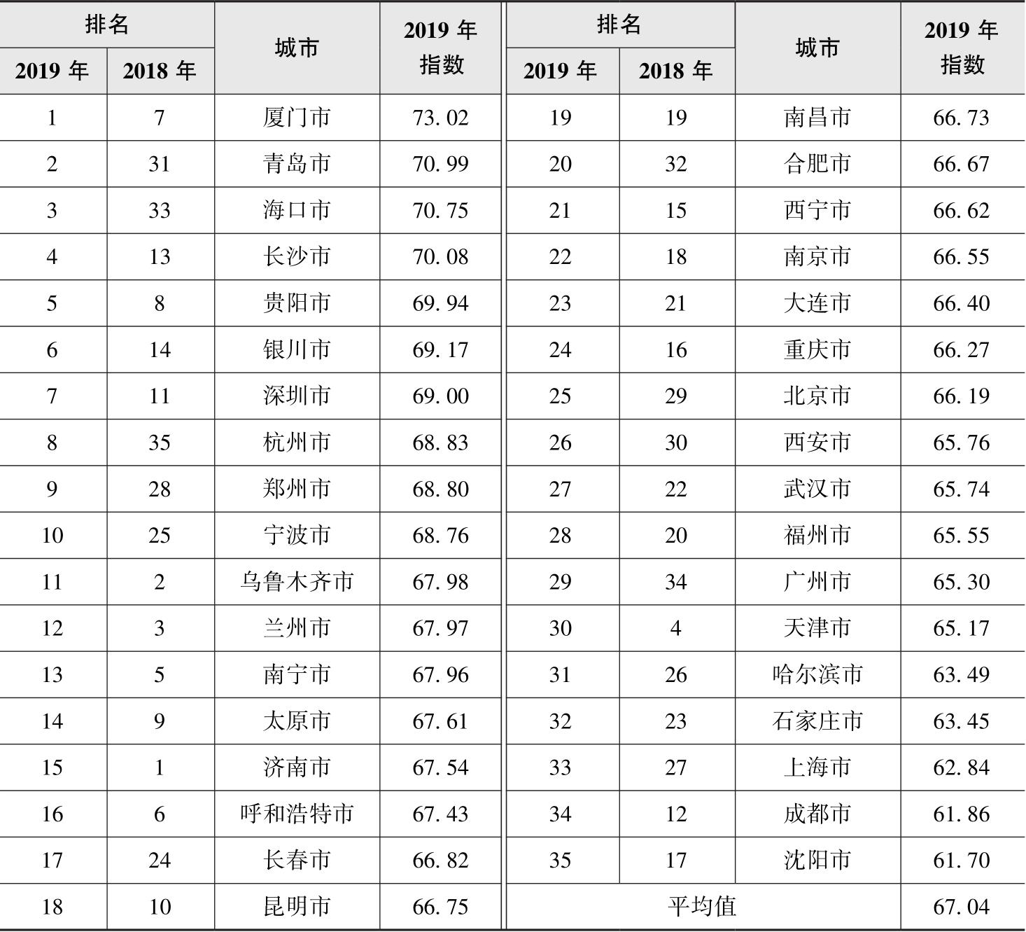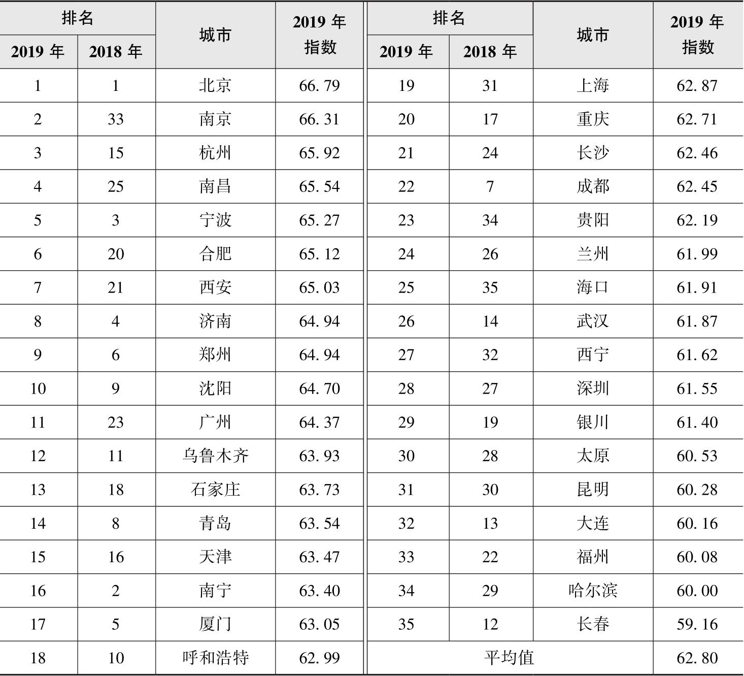 健康状况调查主要体现城市居民对自己健康情况的感知。根据答案赋值,100代表非常好,75代表很好,50代表好,25代表一般,0代表差。2019年,中国35个城市居民健康满意度指数加权平均值为56.99,介于好(50)和很好(75)之间,但低于2018年64.48的水平。表7是2019年中国35个城市居民健康状况满意度调查结果。