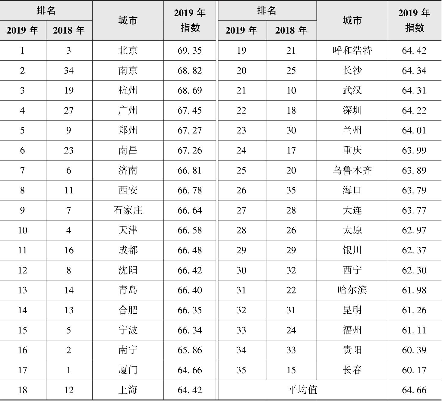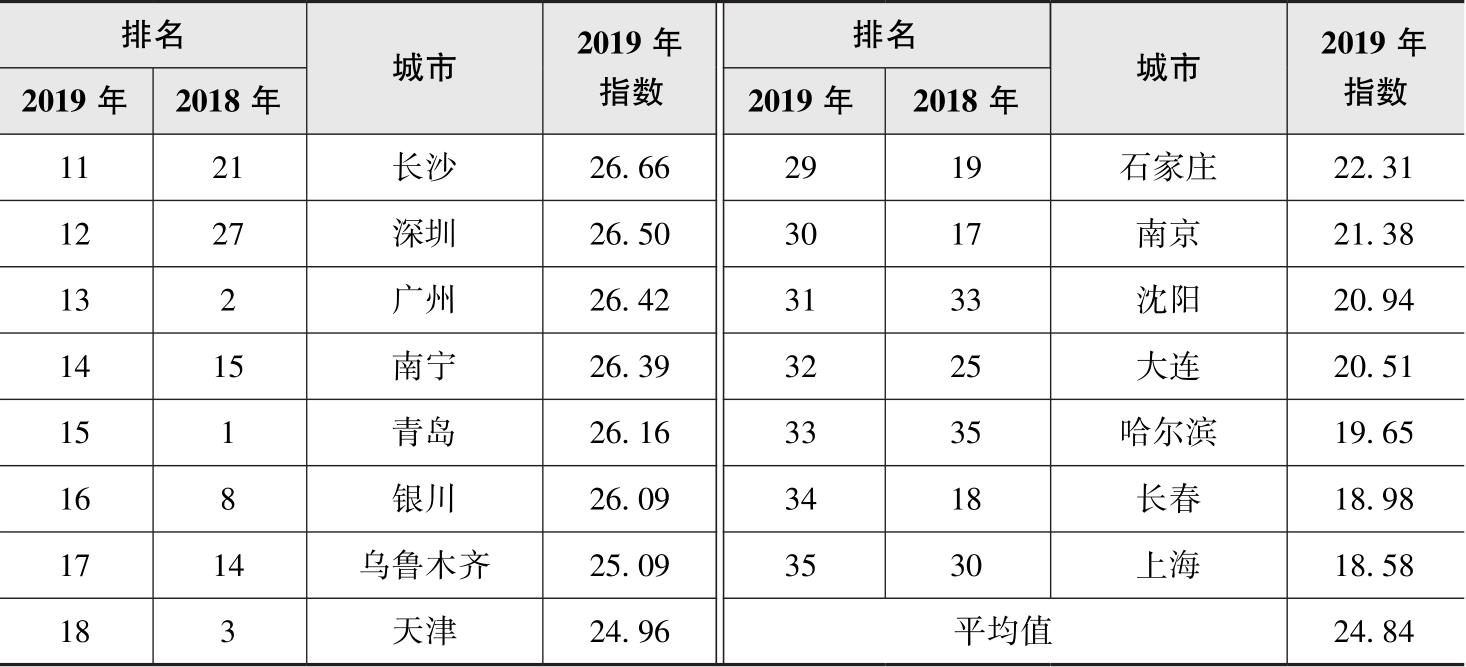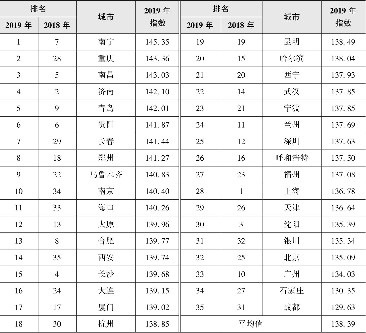 35个城市的消费者信心指数全部超过了临界点100。排在前10位的城市分别是:南宁(145.35)、重庆(143.36)、南昌(143.03)、济南(142.10)、青岛(142.01)、贵阳(141.87)、长春(141.44)、郑州(141.27)、乌鲁木齐(140.83)、南京(140.40);排名后10位的城市分别是:呼和浩特(137.50)、福州(137.08)、上海(136.78)、天津(136.64)、沈阳(135.39)、银川(135.34)、北京(135.09)、广州(134.03)、石家庄(130.35)、成都(129.63)。与2018年相比,重庆、长春、乌鲁木齐、南京、海口、西安、杭州等7个城市居民的消费者信心上升比较显著;上海、沈阳、广州、深圳、兰州、长沙等6个城市居民的消费者信心下滑比较明显。