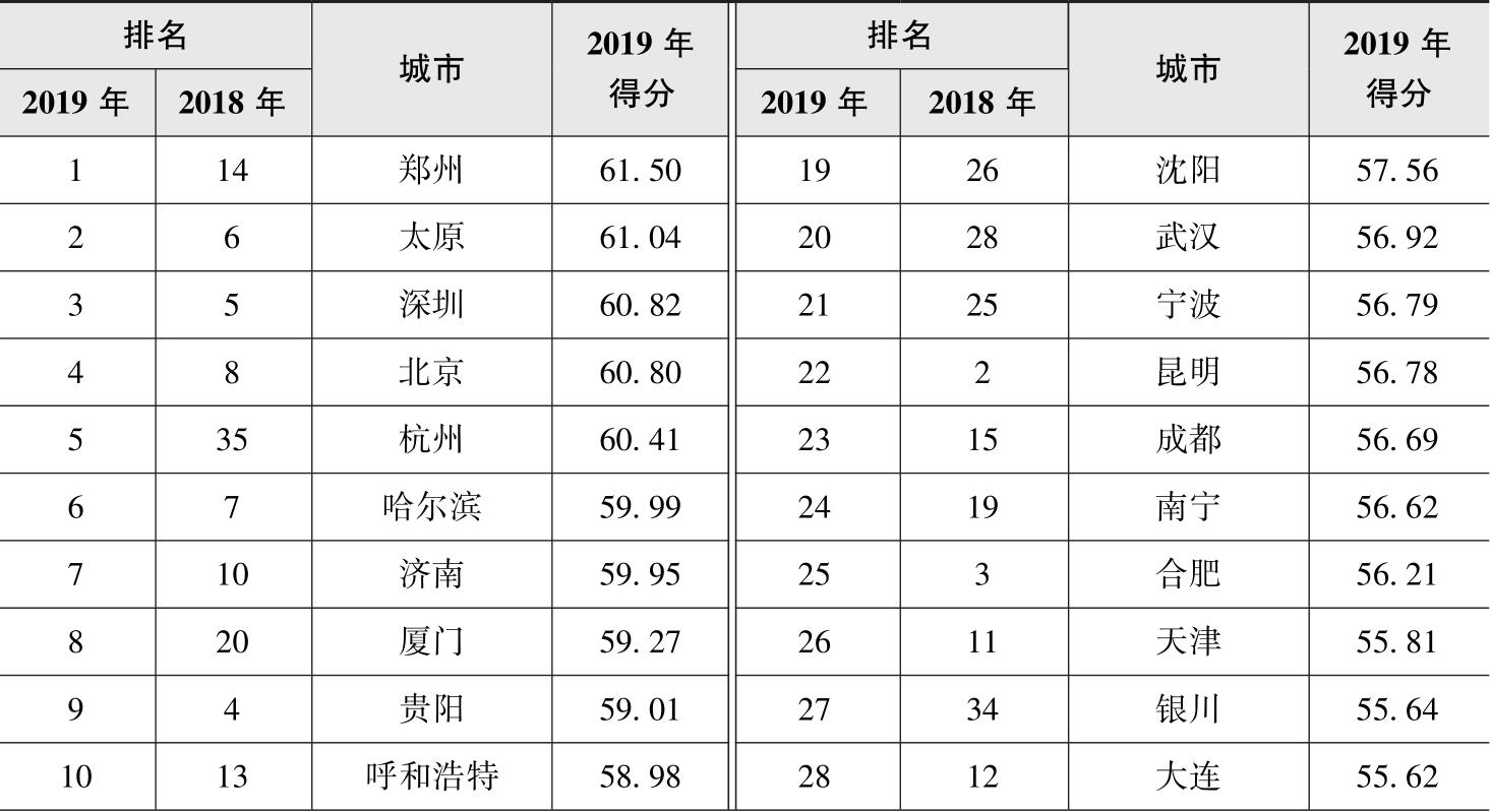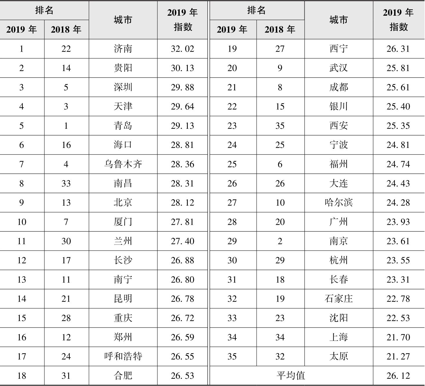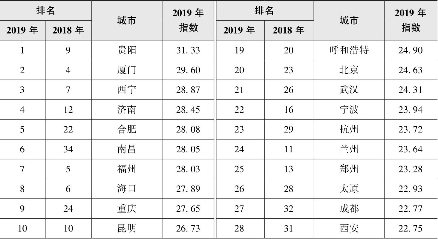 35个城市的消费者信心指数全部超过了临界点100。排在前10位的城市分别是:南宁(145.35)、重庆(143.36)、南昌(143.03)、济南(142.10)、青岛(142.01)、贵阳(141.87)、长春(141.44)、郑州(141.27)、乌鲁木齐(140.83)、南京(140.40);排名后10位的城市分别是:呼和浩特(137.50)、福州(137.08)、上海(136.78)、天津(136.64)、沈阳(135.39)、银川(135.34)、北京(135.09)、广州(134.03)、石家庄(130.35)、成都(129.63)。与2018年相比,重庆、长春、乌鲁木齐、南京、海口、西安、杭州等7个城市居民的消费者信心上升比较显著;上海、沈阳、广州、深圳、兰州、长沙等6个城市居民的消费者信心下滑比较明显。
