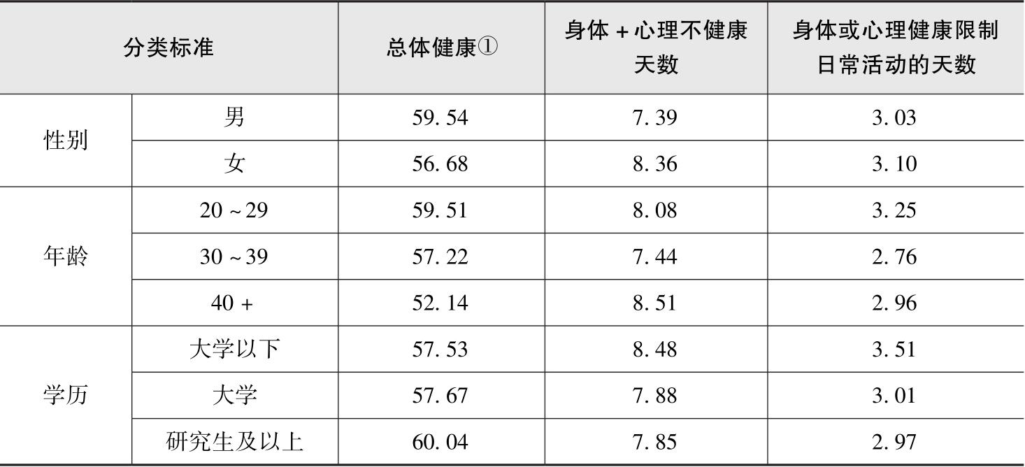 从调查的背景资料分析,表12呈现了不同性别、年龄、学历、是否在职的居民对健康状况满意度情况的调查结果。从总体健康状况来看,男性要略好于女性;学历越高满意度越高。从年龄段来看,20~29岁的受访者在各年龄段中对自己总体健康的满意度最高,但这一群体认为自己身体或心理健康限制日常活动的天数在各年龄段中也是最多的。