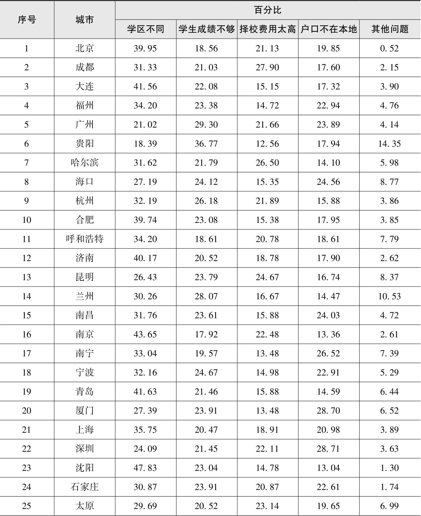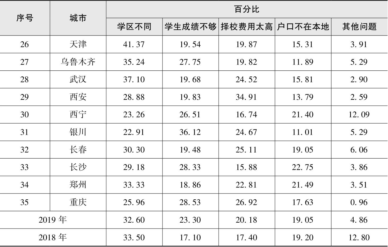表5 2019年中国35个城市居民对学生(或子女)无法进入重点或热门学校的最主要障碍认知情况 (%)