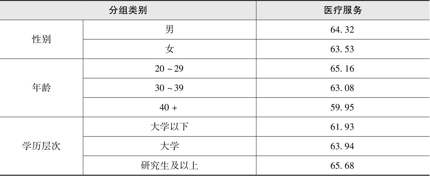 从调查的背景资料分析,男性对于医疗服务的满意度略高于女性;20~29岁年龄段对于医疗服务满意度较高;学历越高对医疗服务的满意度越高。但幅度差异都不大。表16呈现了不同群体对医疗服务的满意度。