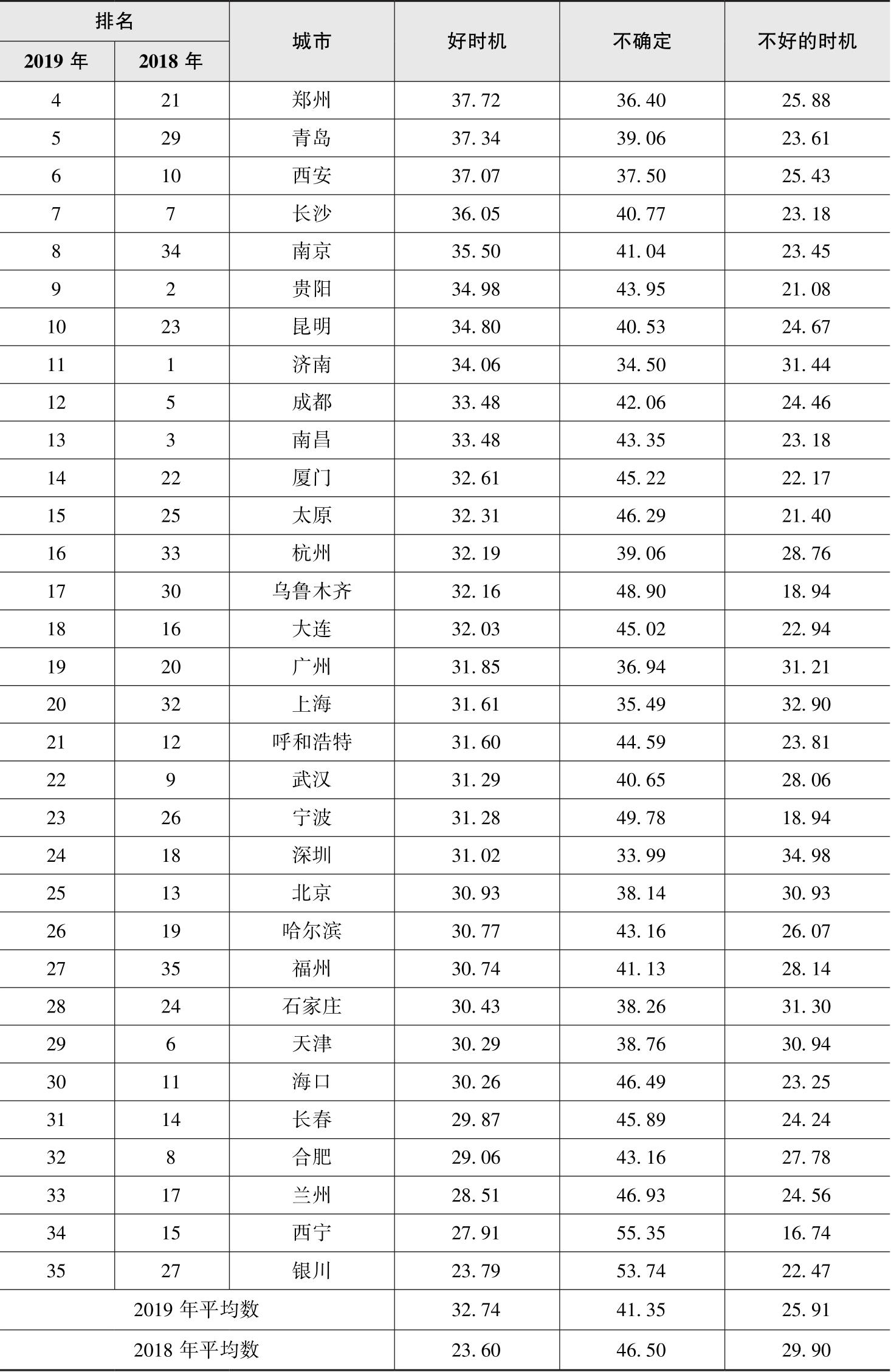 表18 2019年中国35个城市居民购房时机选择调查结果 (%)