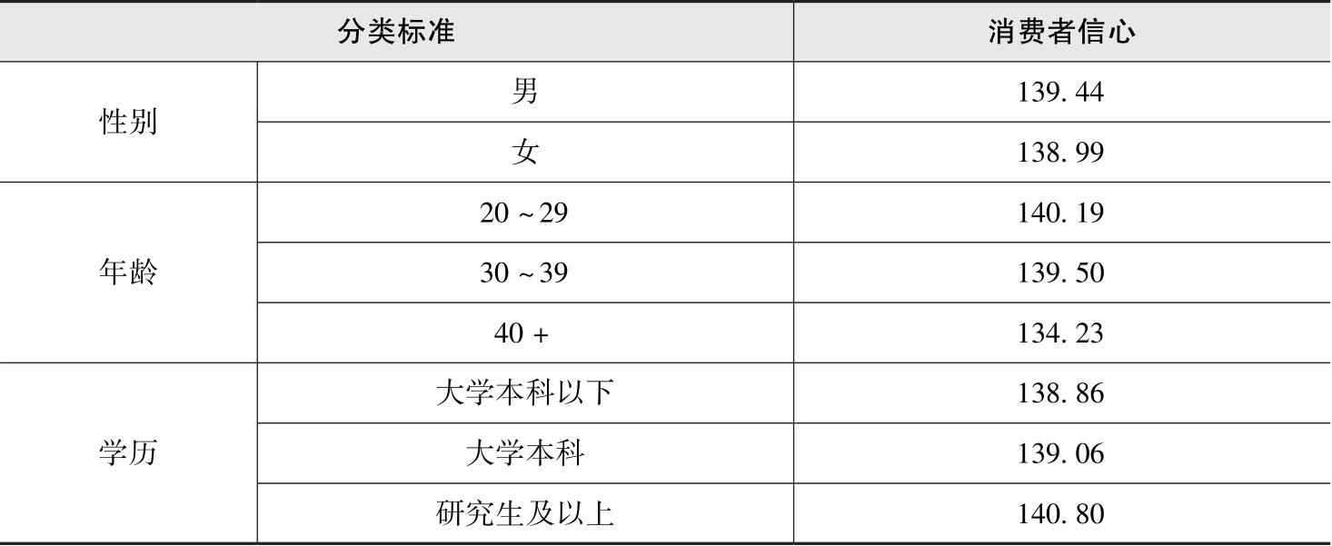 另外,根据调查背景资料分析,不同性别、年龄、学历的消费者信心指数有所不同(见表2)。从性别来看,女性消费者信心指数略低于男性;在不同年龄段中,20~29岁的消费者信心指数最高,40岁以上的消费者信心指数最低,由此可以看出不同年龄段的人群面临的生活压力有所不同,从而使消费者信心存在一定的差异;不同学历中,消费者信心指数与学历水平正相关,研究生及以上的消费信心指数最高,大学本科以下的消费者信心指数较低。我们认为,不同群体消费者信心指数的差异可能与他们的就业状态和收入水平有关。