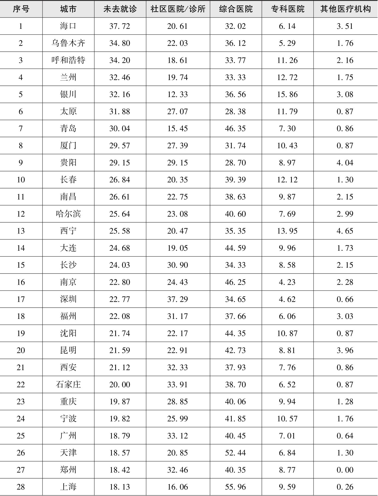 从排序来看,没去过医疗机构就诊比例最高的前10个城市为:海口(37.72%)、乌鲁木齐(34.80%)、呼和浩特(34.20%)、兰州(32.46%)、银川(32.16%)、太原(31.88%)、青岛(30.04%)、厦门(29.57%)、贵阳(29.15%)、长春(26.84%);排在后10位的城市为:天津(18.57%)、郑州(18.42%)、上海(18.13%)、合肥(17.52%)、武汉(17.10%)、杭州(15.88%)、北京(15.46%)、成都(15.45%)、济南(14.41%)、南宁(13.48%)。