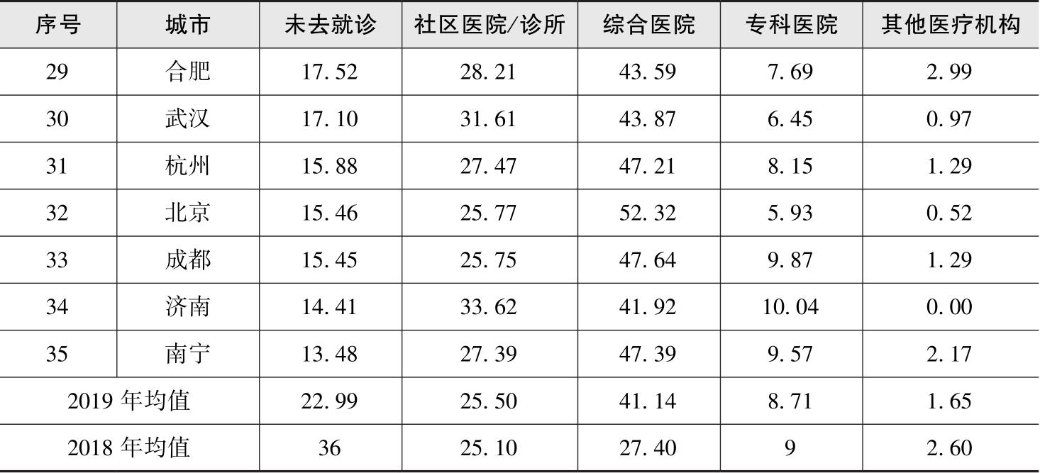 从表17可以看出,2019年35个城市的受访者在过去一年中没有去过医疗机构比例的平均值为22.99%,比2018年的平均值低13.01个百分点,也就是说去过医疗机构的人员比例相比上年上升了13.1个百分点。去过医疗机构的居民中,41.14%的居民选择在综合医院就诊,比上年高出13.74%,社区医院或诊所就诊的比例变化不大。我国分级诊疗制度改革还需要进一步推进。