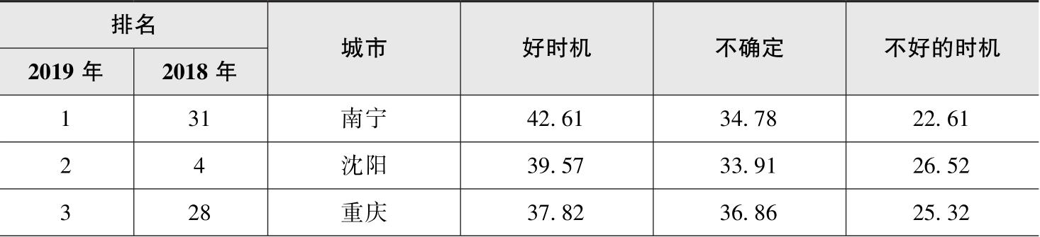 2019年,城市生活质量研究中心继续对35个城市居民购房意愿专项调查,调查问题为“您认为现在是否是购买住宅的好时机?”可供选择的备选答案是:“①好的时机;②不确定;③不好的时机”。调查结果如表18所示。