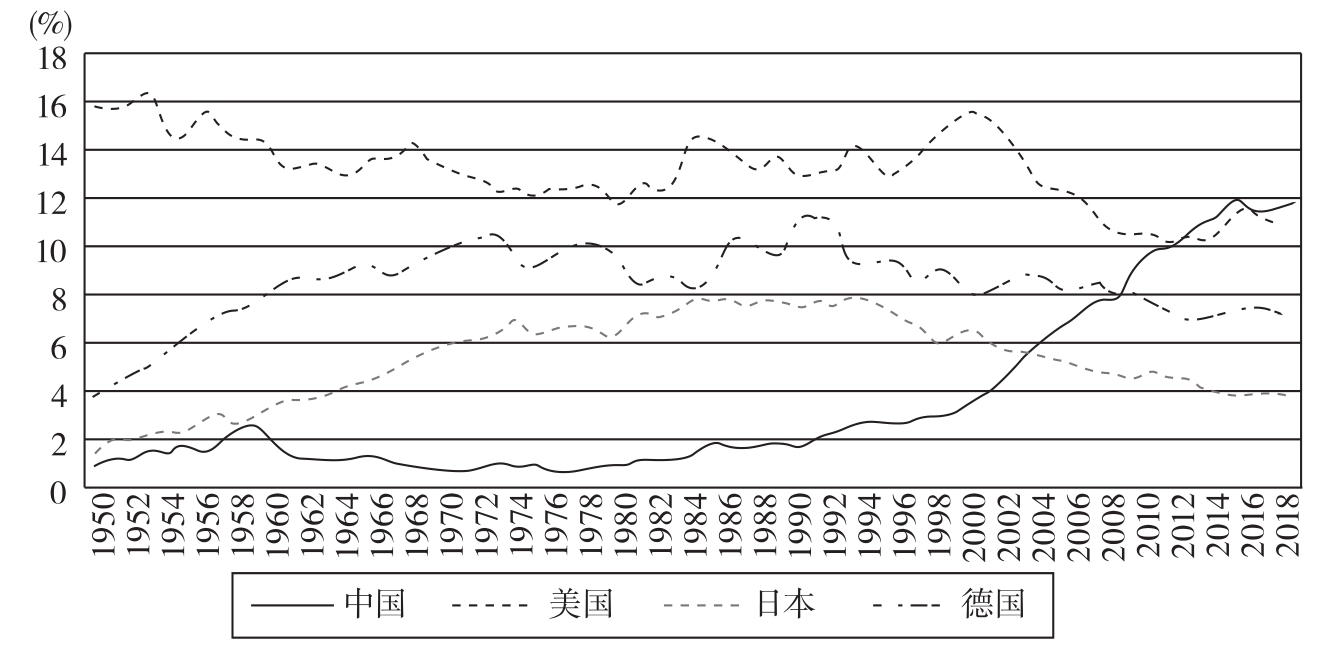 图3 中、美、日、德四国商品贸易进出口总额占全球份额(1950—2018年)