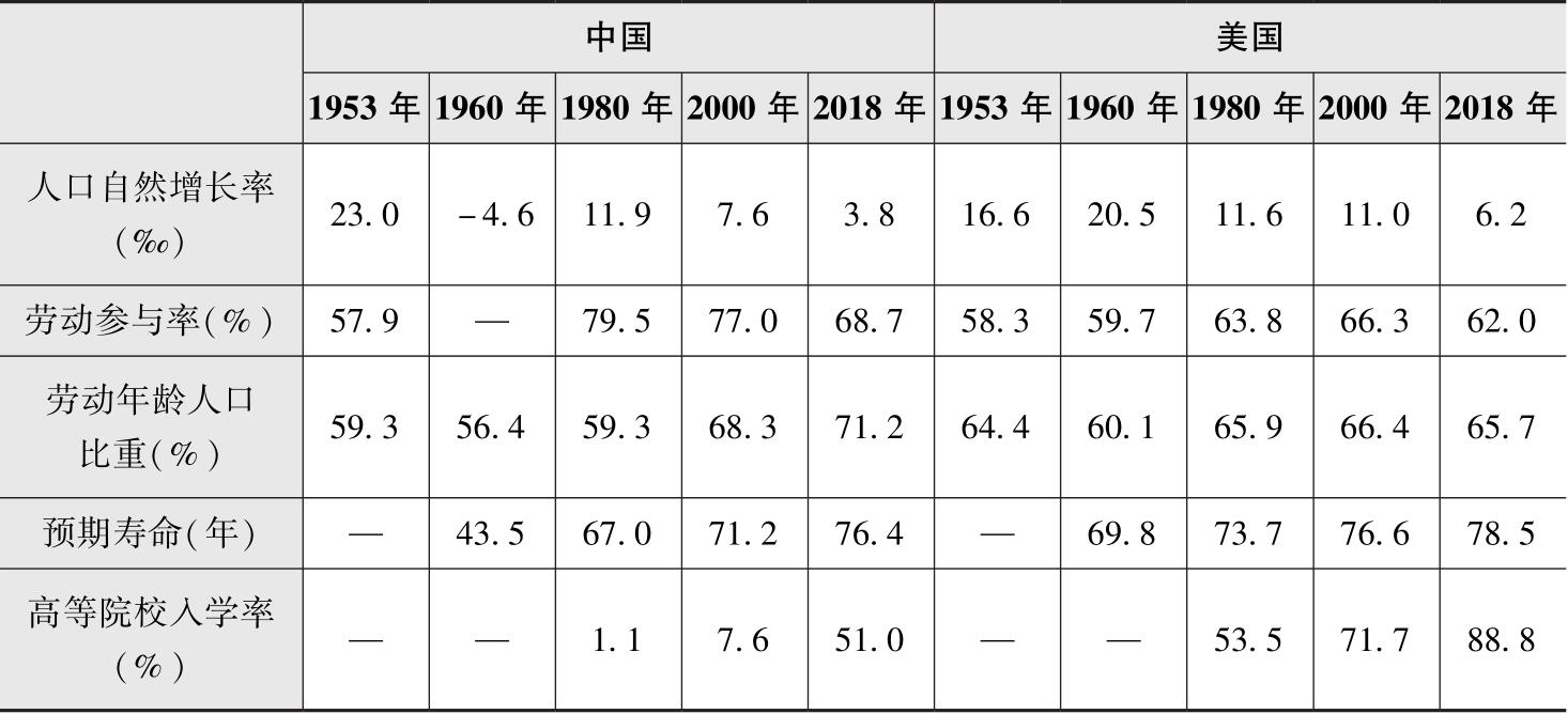 注:①中美两国人口自然增长率数据分别来自国家统计局、美国经济分析局。②1960—2018年中美劳动参与率数据均来自世界银行;1953年中国劳动参与率数据根据国家统计局数据计算得到,计算公式=经济活动人口(就业者和失业者)/15岁及以上总人口;1953年美国劳动参与率数据来自美国劳工部。③世界银行规定劳动年龄人口为15~64周岁,1960—2000年中国15~64岁人口占总人口比重数据来自世界银行;1953年、2018年中国劳动年龄人口比重数据来自国家统计局;1960—2018年美国15~64岁人口占总人口比重数据来自世界银行,因2018年数据缺失,用2017年数据近似替代;1953年美国劳动年龄人口数据根据美国商务部普查局的人口推算数据计算得到,因其统计口径为14~64岁,该值被高估1~2个百分点。④1960—2018年中美预期寿命数据均来自世界银行,因2018年数据均缺失,均用2017年数据近似替代。⑤1980—2018年中国高等院校入学率数据来自世界银行,因2018年数据缺失,用2017年数据近似替代;1980—2018年美国高等院校入学率数据来自世界银行,缺失的2000年数据用1998年数据近似替代,缺失的2018年数据用2016年数据近似替代。