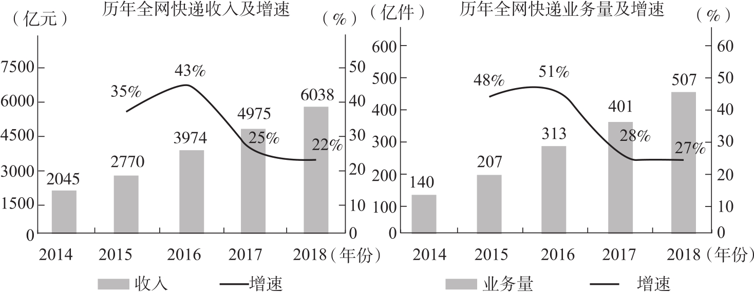 首先,对新增单量的争夺。如今,电子商务增速趋缓,2018年全国网上零售额同比增长28%;相应地,快递业增速开始下降。如图1-7所示,无论是业务量还是业务收入,2016年之后都迅速回落。这时,能否抓住订单量这一重要增长点,显得尤为关键,如拼多多的快递订单。数据显示,2018年拼多多订单量约为111亿个,同比2017年增长了约68亿个订单。假设每个订单对应一个快递单,则拼多多新增的快递单量占全年全网新增快递单量的60%以上。如果企业无法在这些重要增长点上分得一杯羹,则很难保持行业平均增速,在排位赛中自然要处于下风。