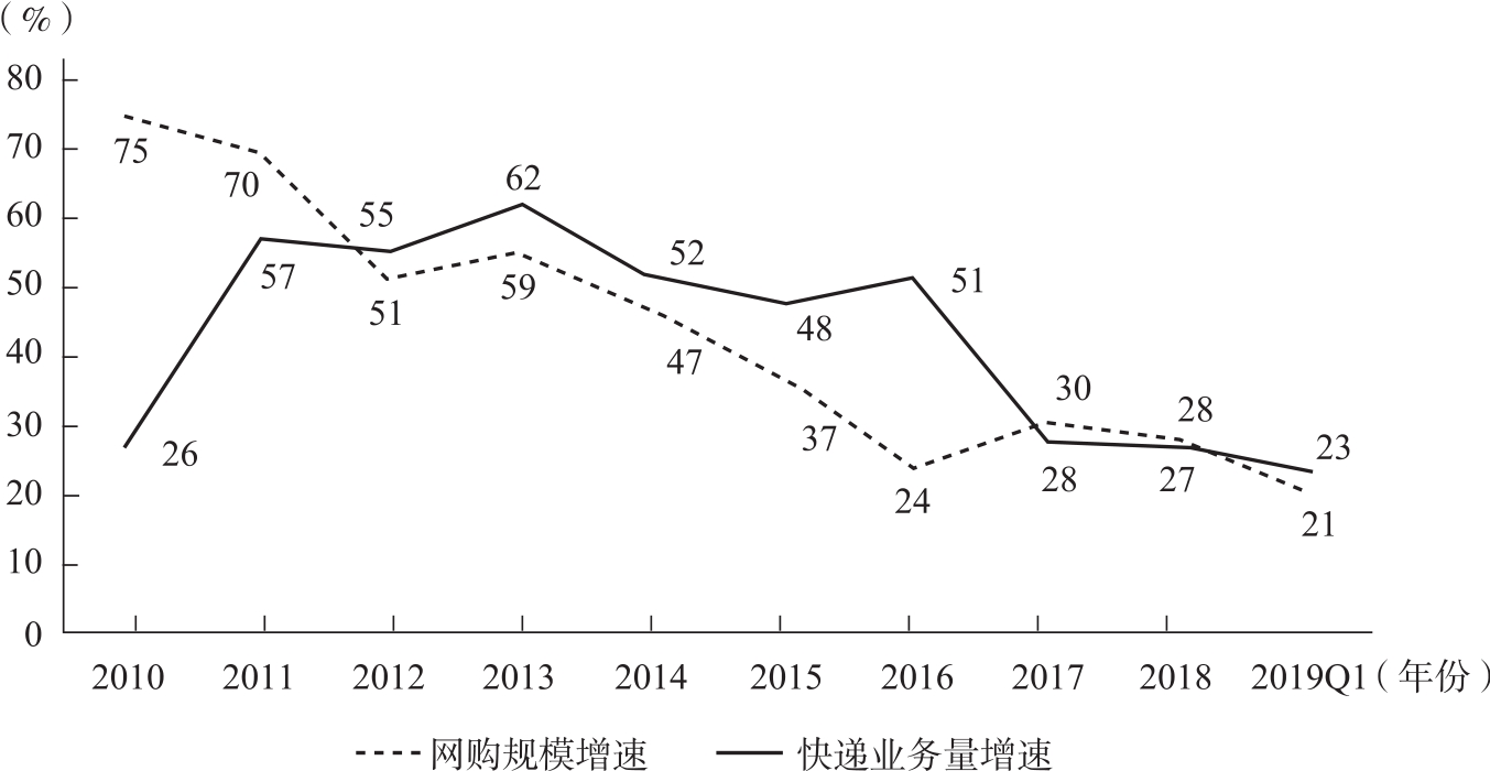 图1-5 2010—2019年第一季度网购规模及快递业务量增速