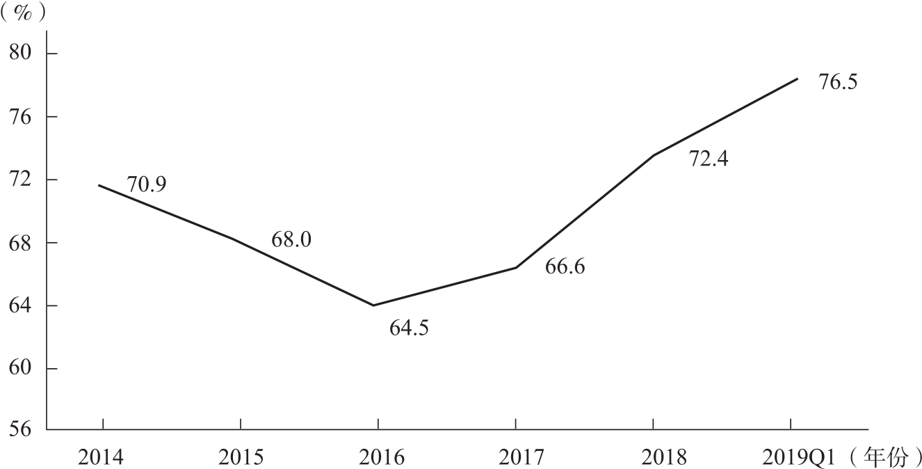 自2017年起,我国快递业从50%左右的高速发展换挡至25%左右的中速发展;2019年第一季度,受春节因素影响,我国快递业务量同比增长速度进一步回落到23%(见图1-5)。2019年1—5月,全国快递服务企业业务量累计223亿件,同比增长24.9%;业务收入2753.6亿元,同比增长23.1%。